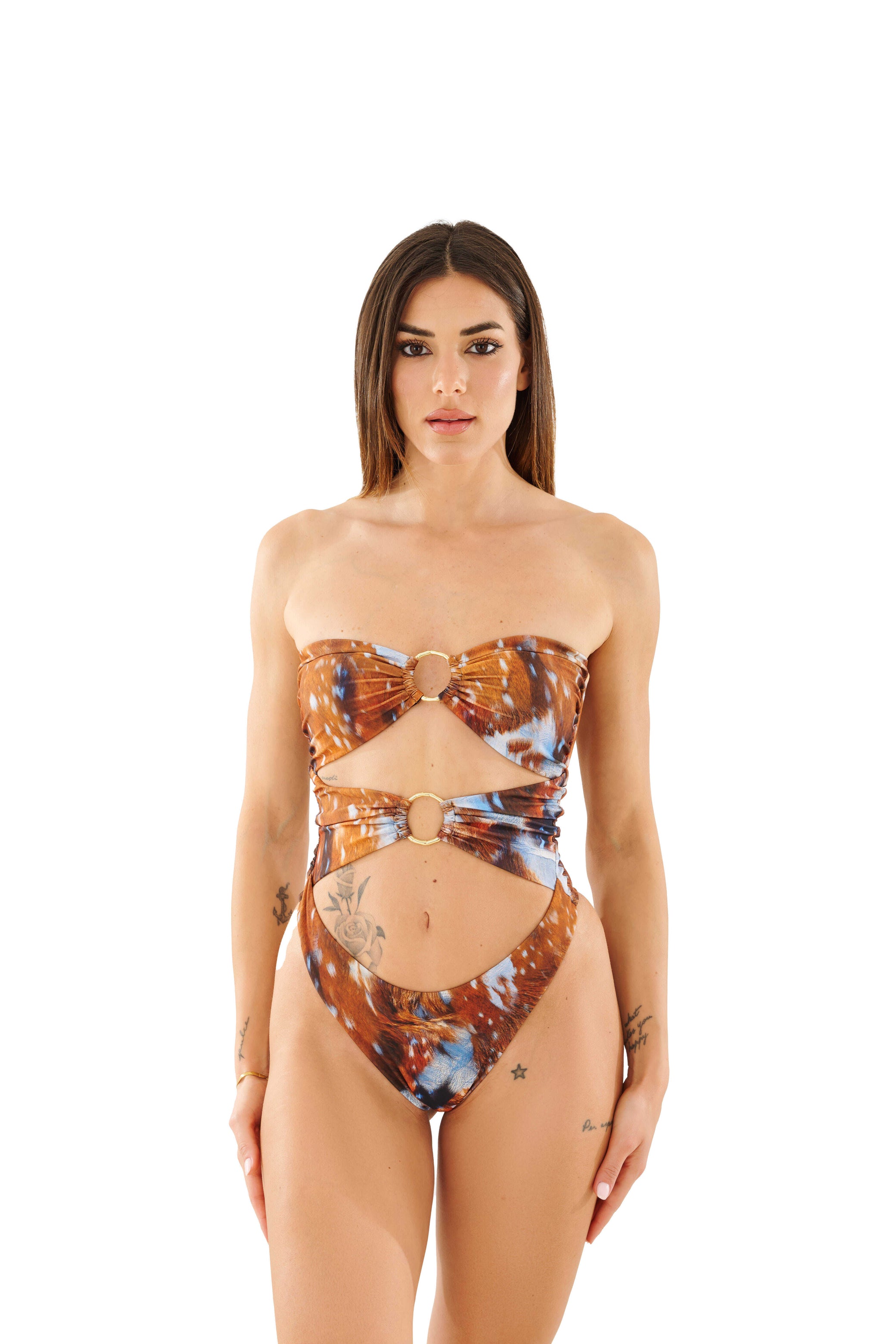 Il design audace avvolge la figura scolpendo le forme con precisione. Al centro, una serie di anelli a taglio geometrico disegna il corpo con armonia. Per una vestibilità ottimale, senza rinunciare allo stile.